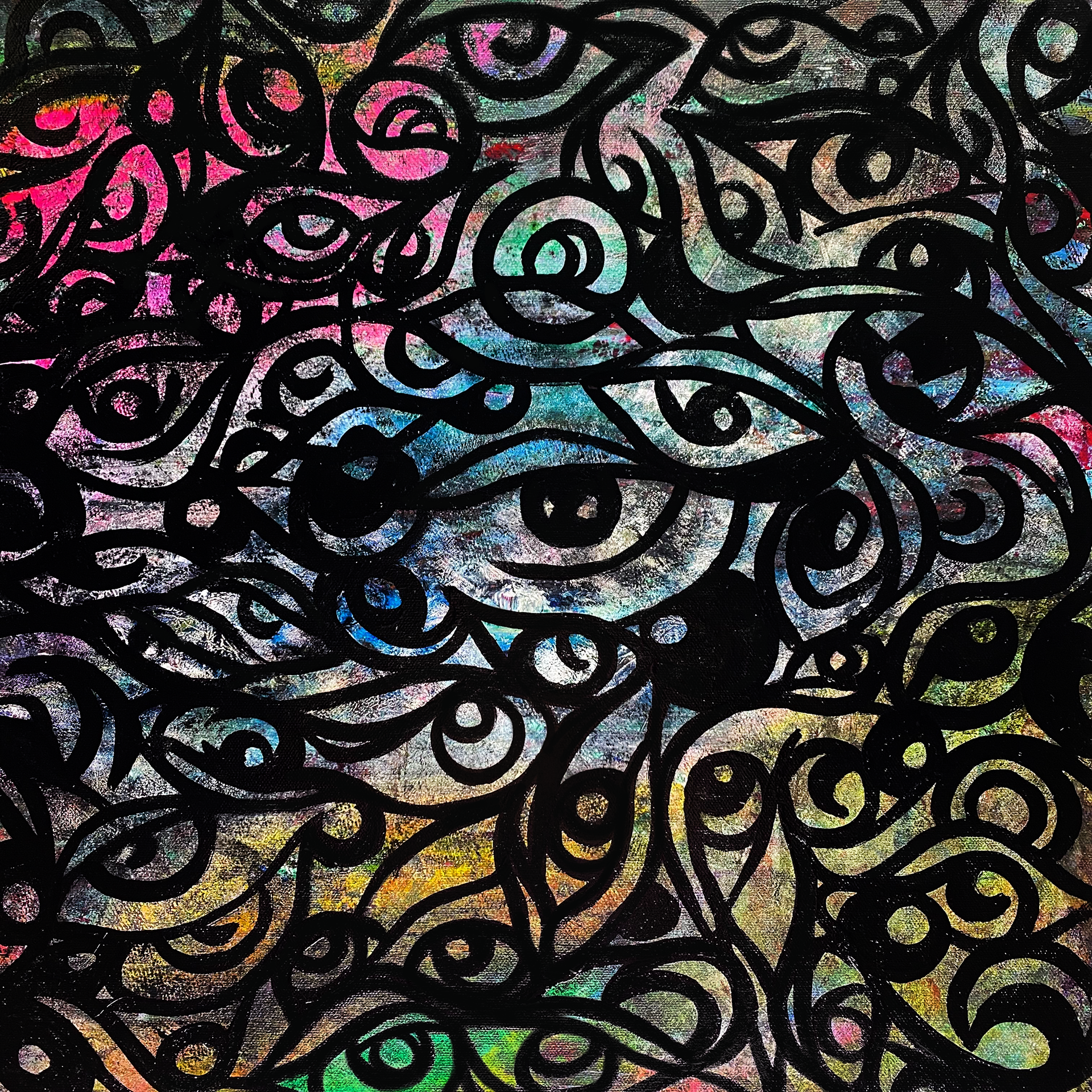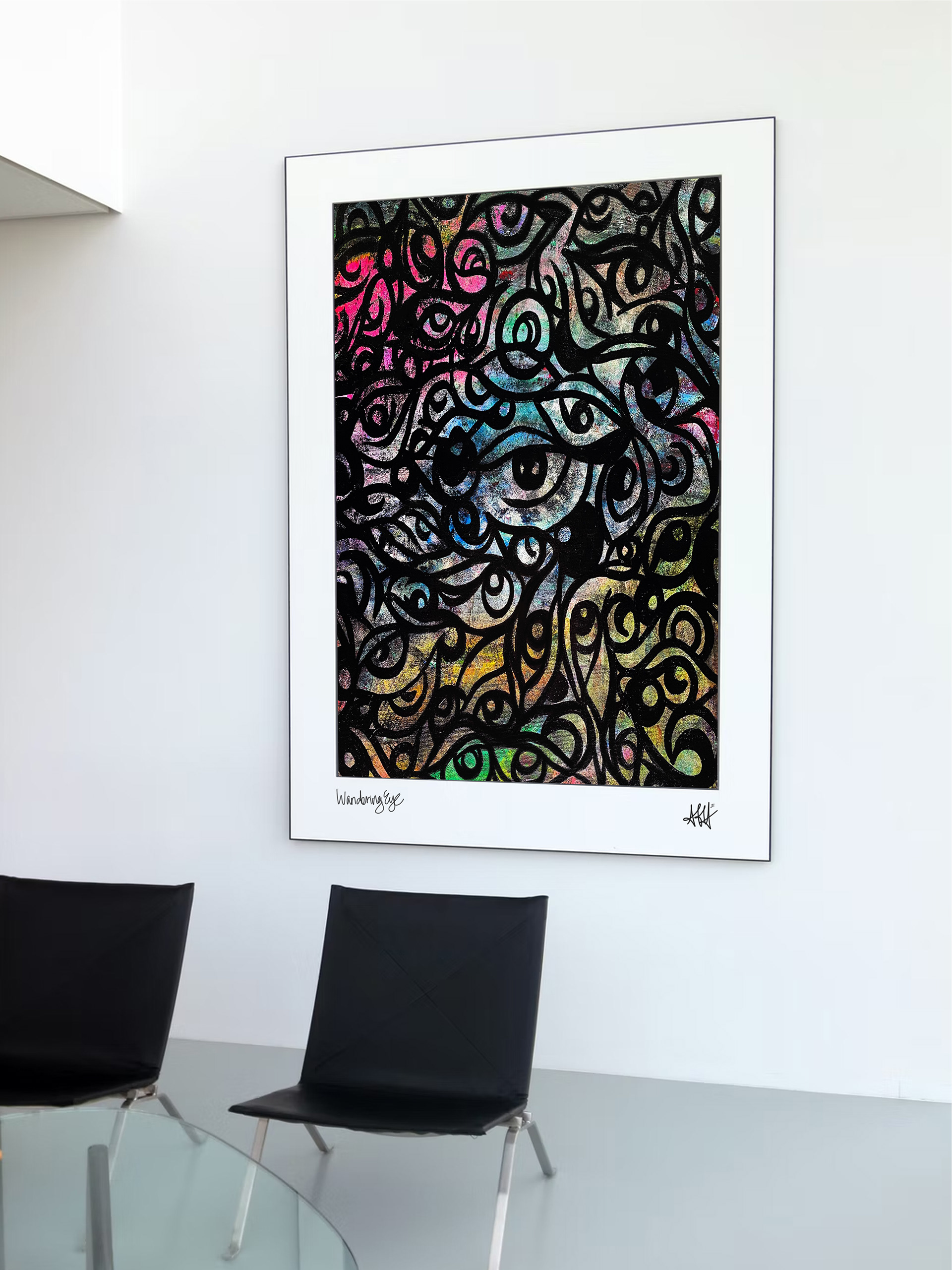 Wandering Eye is an acrylic painting print series made of textured colorful layers and single stroke black eye lines.